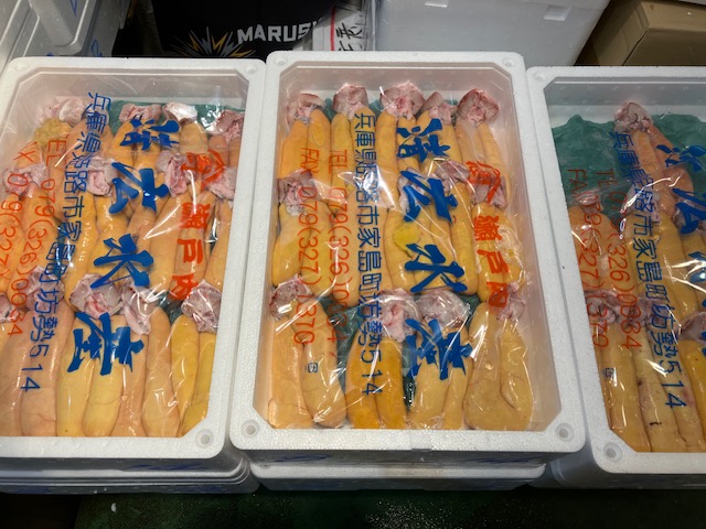 夏の刺身のイカといとえばシロイカです。上品な甘みとイカらしいねっとりとした食感があり、夏の寿司ネタとしても好まれます。ちなみにシロイカの標準和名はケンサキイカ。市場では日本海側のものをシロイカ、伊豆周辺でとれたものをアカイカと呼び分けられています。シロイカの方が肉厚で入荷時期が長いです。